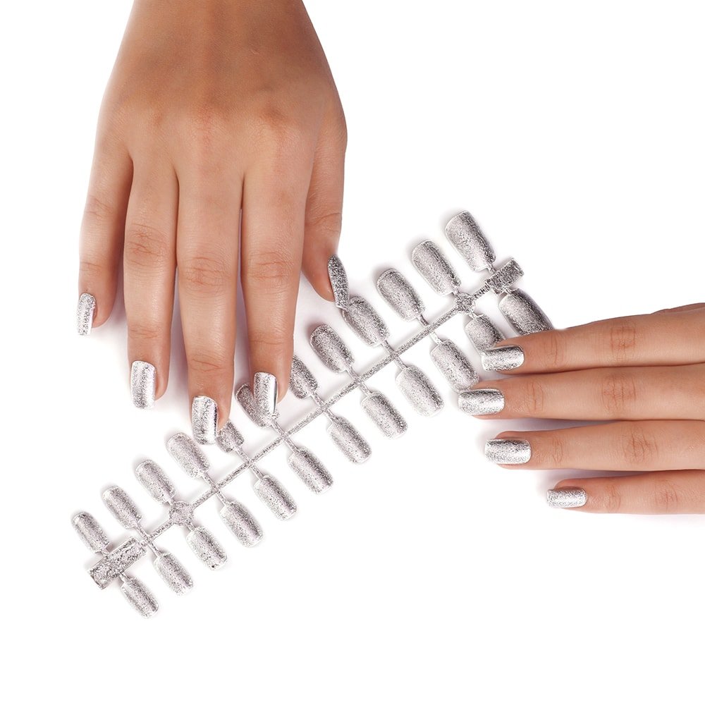 GLAM Dust Silver ready to wear nails are ready, shined, buffed and smooth finished ready nails. The nails look shiny, smooth and classy. The tips are perfectly chrome ready nails tips. It is very easy to use, simple to remove and long-lasting. Once applied with Glam Nail Glue they maintain a firm grip on the nail bed and last up to 12 -1 5 days. If required it can be sealed with topcoat and it supports UV led lamp curing too. It is suitable for any occasion. Ready to wear nails one package includes 24 pieces of ready nails. It is recommended for nail professionals and for home use.